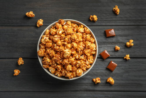 専門店でも人気のキャラメルポップコーン。バター、砂糖、牛乳を煮詰めてキャラメルを作り、ポップコーンを加えて絡める。甘くてカリカリとしたポップコーンは、子どもにも人気が高い味付けだ。