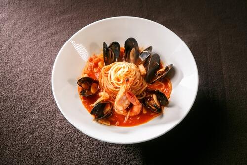 イタリア産の完熟トマトを使ったソースが魅力で、イカやエビなどのほかにナスも味わえるのが嬉しいパスタだ。大きなリング状のイカが特徴的である。