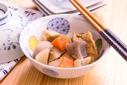 ニンジン、ダイコン、サトイモ、ゴボウの皮をむき、一口サイズに切る。また、こんにゃくや豆腐、厚揚げも食べやすい大きさに切っておこう。決まった切り方はないが、ニンジン、ダイコン、サトイモ、豆腐、こんにゃくなどは角切りにする家が多いようだ。