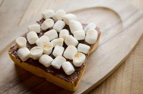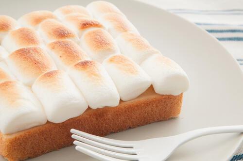 マシュマロトーストは、トーストにマシュマロをのせて焼いた食べ物だ。一般的には食パンを使用する。トースターで加熱するとマシュマロがとろけて、香ばしく焼けたパンとよく合うのだ。マシュマロの表面にほどよく焼き色がついた見た目も特徴的である。スイーツのような味わいのため、おやつとして食べられることが多いが、朝食にもなる。