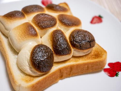マシュマロは焦げやすいため、食パンを先に焼いてからトッピングしよう。最初にパンを焼いておけば、再度焼くときにはマシュマロに焼き色をつけるだけで済む。マシュマロをのせたあとは、トースターのそばで見守りながら焼き具合をチェックすると安心だ。