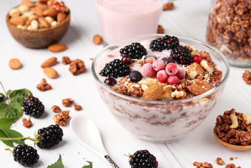 ナッツのほか、フルーツをプラスするのもおすすめ。フレッシュなフルーツを添えてもよいが、冷凍のブルーベリーやストロベリーを常備しておけば、さっと上からかけるだけで手軽に彩りをプラスできる。カットする手間もないため、忙しい朝にもピッタリ。