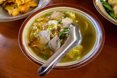 店によっても異なるソトババット。テールなどが入ったより濃厚なソトババットも現地ではポピュラー。屋台やレストランで広く食べることができるメニューだ。
