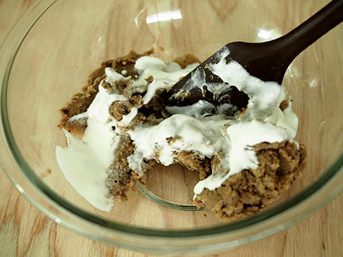 市販されているタルト生地やスポンジケーキを使えば土台部分はまったく作る必要がない。しかしモンブランには欠かせないマロンクリームは手作りする必要がある。まず用意した生クリームを2つのボウルに分ける。1つはマロンクリームと混ぜる用、もう1つはそのまま生クリームだけで使う。生クリームだけで使うものは9分立て(ツノが立つくらい)に泡立てて、丸口金をつけた絞り袋に入れる。