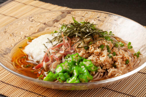 次にそばを袋の表示通りに茹でて流水でもみ洗いし、水気をきって器に盛り付ける。その上に混ぜた納豆・山芋・オクラ・ねぎ・みょうがを盛り付け、めんつゆをかければ、オクラと納豆のとろろそばの完成だ。好みでねぎの代わりにカイワレ大根をのせたり、海苔を散らしたり、青じそをトッピングしたりしてもOK。また刻んだたくあんをのせて食べるとコリコリとした食感を楽しめる。