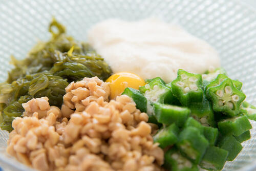 納豆はそのままでも細かく刻んでもOK。山芋は皮をむき、すりおろすか細かく刻む。あとは器に山芋・納豆・めかぶ・オクラを盛り付ければ、ねばねば和えの完成だ。しょうゆやめんつゆで味付けし、好みで卵の黄身をトッピングし混ぜて食べるのもありだろう。辛い味が好きな人はラー油をたらしてピリ辛にしても。