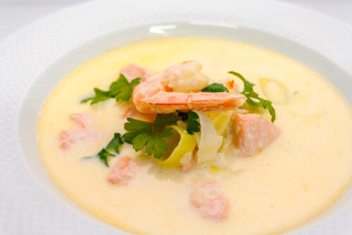 鮭と大根をフライパンで一度焼き、その後生クリームか牛乳を鍋に入れる。さらにコンソメを入れて溶かし、味を調えていこう。とろっとするまで煮込むのがポイント。もしも牛乳を使った場合は、最後に片栗粉を入れるととろみがつく。
