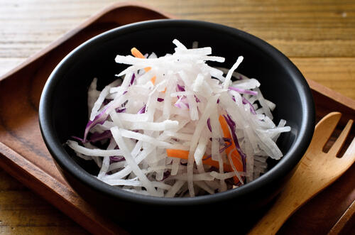 焼いた鮭の皮と骨をとり、そこに細かくカットした大根を加える。大根は塩をかけて水分を絞っておこう。薄口醤油と砂糖、酢などの調味料で味付けをすればできあがりである。