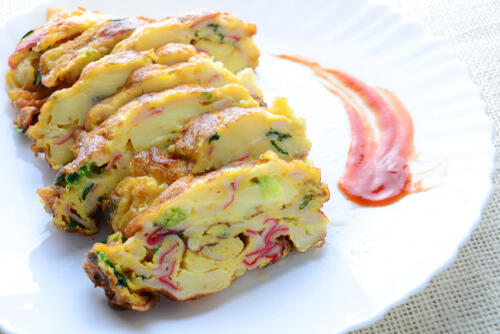 きのこなどを加えて、両面をしっかり焼くか卵焼き風に巻いて焼く。中心部まで火が通るため、弁当のおかずにもぴったりである。