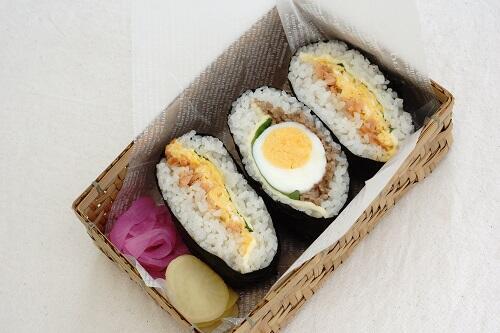 また、茹で卵は大抵の食材と相性がよいので、彩りのバランスを取るためにとりあえず入れてみる、といった使い方ができるのもメリットのひとつだ。サンドイッチやサラダのテイストを取り入れた洋風のおにぎらずや、ガッツリとした肉系の茶色一色のおにぎらずに色を添えたいという時に茹で卵を一緒に入れるとよいだろう。