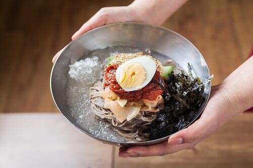 見た目から辛そうな韓国冷麺だが、2種類あることを知っているだろうか。韓国冷麺とひとくくりにしているが、実は「ビビン冷麺」と「水冷麺」があるのだ。ビビン冷麺は赤く辛いのが特徴で、水冷麺は盛岡冷麺のように出汁をとり冷たいスープにして食べる。主に肉類などから出汁をとったら、大根で作った水キムチ(トンチミ)を混ぜる。食べると口の中がサッパリするのでやみつきに。