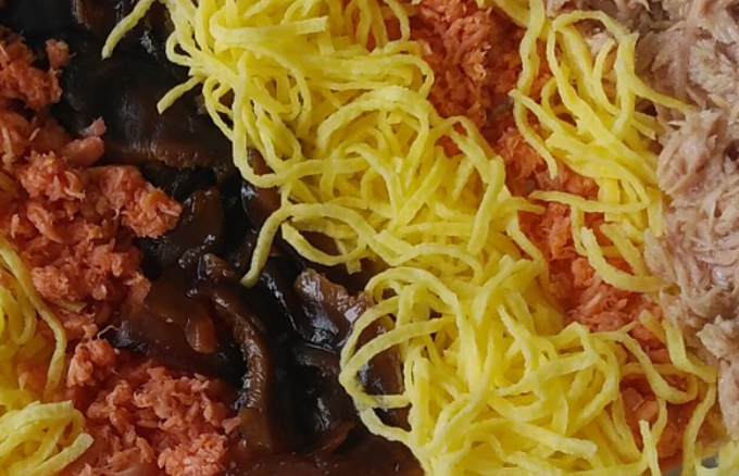 次に箱ずしを作っていく。まずむきエビを包丁で叩きすり身にしたら出汁・しょうゆ・砂糖で煮る。焼き穴子も出汁・しょうゆ・砂糖で煮る。塩鮭は焼いてほぐす。干し椎茸は水で戻し、薄切りにしたら砂糖としょうゆで煮る。卵は砂糖と塩を加えて混ぜ、そぼろ卵にする。