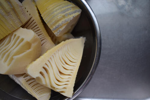 次に、たけのこの木の芽和えの食べ方を紹介しよう。たけのこの木の芽和えを美味しく味わいたいなら、たけのこのアクを抜いておくことだ。自分でたけのこを茹でて使用する場合は、皮付きのまま先のほうを1/4くらいななめに切り落とし、皮に縦の切れ目を入れ、水を入れた大きな鍋に水の1割ほどの米ぬかか米の研ぎ汁と赤とうがらしを加え、落としぶたをして浮かないようにして火にかける。