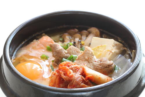 長ねぎは1cm幅に斜め切りにし、しめじは小房に分け春菊とキムチはざく切りにし、豆腐は食べやすい大きさにカットする。鍋に水・酒・味噌・鶏がらスープの素・豆板醤を入れて火にかけ、鮭とあさりを加えふたをして3~4分ほど煮る。次に長ねぎ・しめじ・春菊・豆腐を加え、ひと煮立ちさせて火からおろしキムチを加えて混ぜる。あとは温泉卵を加えればキムチ鍋の完成だ。食べるときは温泉卵をくずしながら味わうと美味しい。スープが残ったら茹でたうどんを加えたり、ごはんとゴマ油を入れて汁気がなくなるまで炒め合わせて海鮮ビビンバ風に仕上げたり、スープも残さずぜひ最後まで美味しく味わってもらいたい。ちなみにスープとごはんの比率は1:1がおすすめだ。