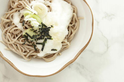 自然薯を使った冷たいとろろ蕎麦に合わせてもらいたいトッピングがオクラとめかぶ、梅干しだ。オクラとめかぶというネバネバ食材をとろろと合わせることで、よりネバトロ感が楽しめる蕎麦になる。さらに梅干しをトッピングすることで酸味が加わり、食欲がないときでも食べやすく夏バテ予防などにもおすすめの蕎麦になる。ネバネバ食材はさまざまな健康効果もあるとされており、身体によい成分を豊富に含むとろろと合わせることで栄養満点の蕎麦になるのだ。