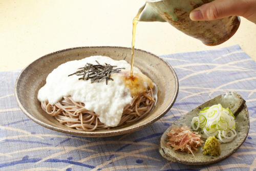自然薯を使ったとろろはまさに蕎麦との相性がバツグンだ。強い自然薯とろろの粘り気が蕎麦によく絡み、のど越しのよい味わいが楽しめるのだ。また、とろろ蕎麦にはほかの具材などを組み合わせることで、さまざまな食感や味わいが楽しめるのでいろいろなアレンジもしやすい。ぜひ自然薯とろろを蕎麦にトッピングして最高ののど越しと自然薯ならではの風味を楽しんでもらいたい。