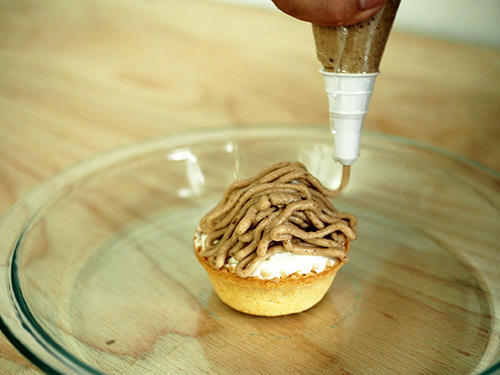 生クリームはマロンクリームを作るときだけではなく、単体でも欠かすことができない。マロンクリームに覆われているため存在感は薄いが、モンブランのクリームの中心には生クリームが使われており、マロンクリームと一緒に食べることで口溶けのよい食感が生み出されている。生クリームの周りにマロンクリームを絞っていくので、手作りする場合はツノが立つまでしっかりと泡立てよう。