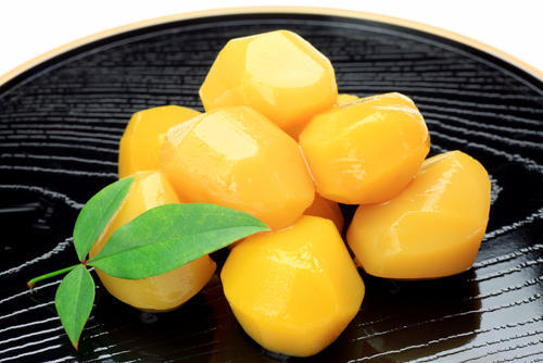 甘露煮は皮をすべてむいて黄色く仕上げている。皮をむいただけでもきれいな黄色が出てくるのだが、クチナシを使うとより色鮮やかな黄色になる。渋皮煮のようにアク抜きをする必要がないため家でも作りやすく、ホクホクとした栗の味わいを楽しめる。