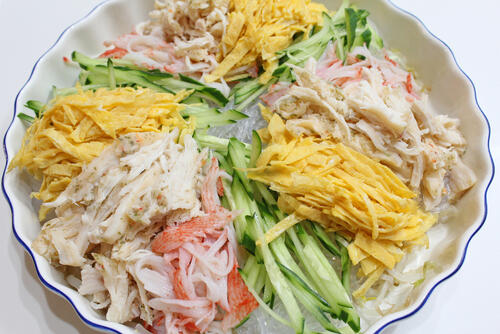 中華麺の代わりに春雨を使用し、トッピングにきゅうりやハムをのせた冷やし中華風にチャレンジしてみよう。ゴマダレや醤油ダレなど、好みの味で食べてみてほしい。中華麺よりも軽く食べられるため、食欲の落ちる時期にもピッタリのアレンジ料理だ。