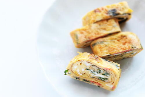 表面が半熟状になったら同じように奥側から手前に巻く。この流れをあと2回繰り返せばOK。完成したら出汁巻き卵を取り出し、別のペーパータオルで全体を包んで落ち着かせ、食べやすい大きさに切り器に盛り付けよう。好みで大根おろしを添えたり、マヨネーズをつけたり、青のりの代わりに青ねぎやワカメを使用してもよい。