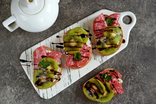 フルーツに生ハムを巻いてワインと一緒に食べることは多いが、ハムはキウイとも相性バツグン。甘酸っぱいキウイと塩気のあるハムが、互いの味を引き締め合うのだ。生ハム以外にも、サラミや焼いたベーコンもおすすめ。