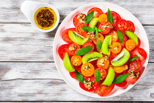 カットしたキウイやトマト、ルッコラなどいろいろな色の野菜を飾るだけで鮮やかなサラダが作れる。シンプルな食材で作ったサラダはどんな味付けにも合わせやすいため、好みのドレッシングで楽しめるのも嬉しいポイント。焼いた鶏肉やベーコンをプラスすれば、ボリュームもアップする。赤や緑、黄色やオレンジなどさまざまな色の食材を組み合わせるとよりカラフルに仕上がる。全体のバランスを見ながら、彩りよく好きな食材を飾ってみよう。仕上げに粉チーズやナッツなどをふりかけると、よりオシャレな見ためになりおすすめだ。