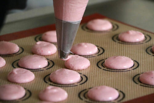 次にトゥンカロンの作り方を紹介しよう。下準備として天板の上にクッキングシートを敷き、4.5cmくらいの円を描く。また砂糖とアーモンドプードルを合わせふるっておく。ではトゥンカロンを作っていこう。まずボウルに卵白を入れハンドミキサーで大きな泡が立つまで混ぜる。粉砂糖を3回に分けて入れ、そのつど泡立てる。最後に食紅を入れ、さらにツノが立つまでしっかりと泡立てればメレンゲの完成だ。