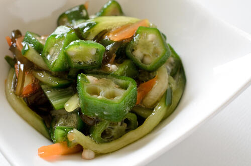 オクラときゅうりの和え物は温度も重要だ。冷たくして食べると美味しい料理のため、作って味をなじませている間は冷蔵庫に入れておき、食べる直前に取り出すとよい。