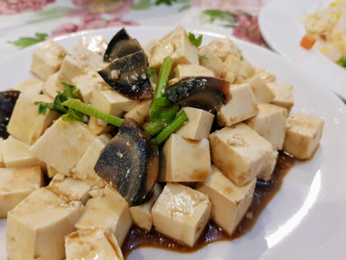 最初にピータン豆腐のカロリーを紹介しよう。ピータンは中国の伝統食材のひとつで、アヒルの卵をアルカリ性が強い環境で熟成した加工食品だ。インパクトのある見た目と独特の香りに食べるのを躊躇する人もいるようだが、調理方法によってはクセになる美味しさを堪能できる。