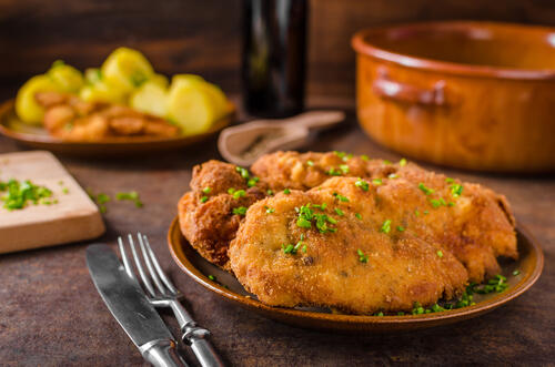 基本のシュニッツェルにトマトソースをかけたもの。パッと目を引くトマトとソースの鮮やかさは見た目も華やかである。ドイツのシュニッツェルは、仔牛ではなく豚肉を使うのが定番である。日本の家庭では牛肉よりも豚肉を使うことが多いので、日本人にとっても使いやすいかもしれない。トマトソースにバジルやオレガノなど好みのハーブを加えて、味付けをしてシュニッツェルにかけてみよう。