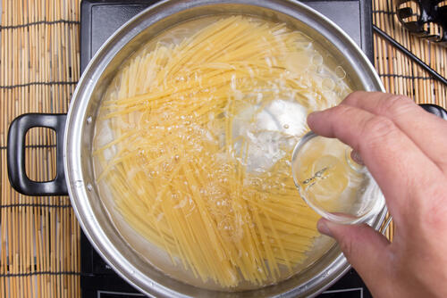 次にスパゲッティーをアルデンテに茹でる方法を紹介しよう。まず大きめの鍋に水を入れて火にかけ、ぐらぐらと沸騰したら塩を加える。加える量の目安はスパゲッティー100gに対し水1L、塩5~10gだ。次に沸騰した湯の中にスパゲッティーを入れる。入れるときは放射線状に広げ、湯に沈んだらスパゲッティー同士がくっつかないようかき混ぜる。