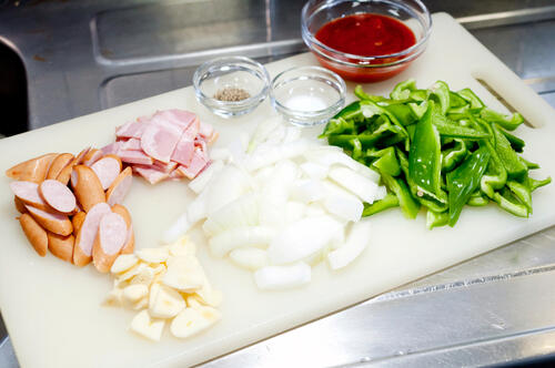 オリーブオイルを熱したフライパンにしめじ・ソーセージ・ピーマンを入れ、軽く炒めたら塩こしょうをして取り出す。続けてフライパンに、みじん切りにしたにんにくと1cm幅に切ったベーコンを入れて弱火で炒める。にんにくに色がついたらみじん切りにした玉ねぎを加え、中火で軽く色づくまで炒める。