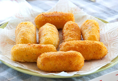 潰したじゃがいもに片栗粉・牛乳・コンソメ・粉チーズ・塩・黒こしょうを加えて混ぜ、ラップにのせて楕円形にのばし、ナポリタンを細長くのせ、じゃがいもで包むように巻く。形が整ったら卵とパン粉の順につけ、5分ほどおいて落ち着かせる。次にサラダ油を170℃に熱し成形したコロッケを入れ、キツネ色になるまで揚げ、油をきって取り出す。