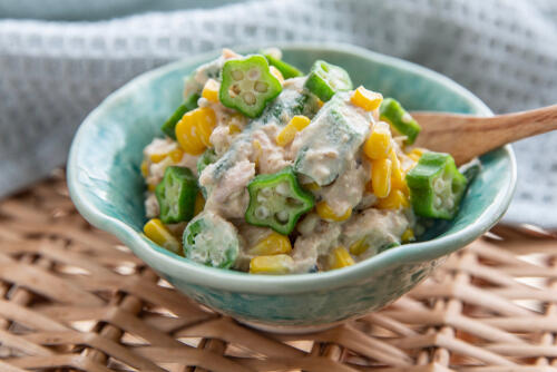 ヘタの先を切りガクの部分をむいたオクラを塩もみし、1分ほど茹でたオクラをツナと調味料で和えるだけというシンプルな料理。どんな味付けにも合い、サラダの具やごはん、麺類のトッピングとしても使えて便利である。ツナのカロリーが気になる場合はノンオイルタイプを選ぶとよい。