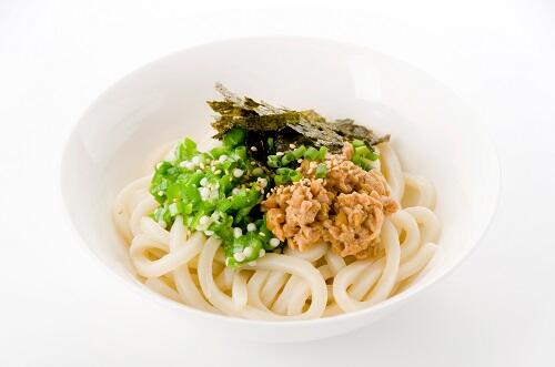 茹でて冷やしたうどんにオクラとツナをトッピングして、めんつゆ、マヨネーズをかけるだけ。オクラはまるごと、もしくは2~3等分にカットするのがおすすめだ。レタスやきゅうりなどを追加するとより食べやすくなる。かつおぶしや海苔、ごまなどをかけると美味しい。