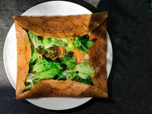 ガレットもケークサレと同様にフランス発祥の料理である。元々はそば粉で作られ薄く円形に伸ばして焼くクレープの元になった料理で、生ハムや魚介類、卵やチーズ、サラダなどを飾る。クレープのように巻く場合は蒸しえびやアボカド、サニーレタスや水菜などがおすすめだ。なお、「生地に穴が開いてしまったり破れてしまう」という場合は、生地を寝かせるようにするとよい。生地を混ぜたあとに冷蔵庫で1時間程度寝かせると生地が均一になり破れにくくなるのである。