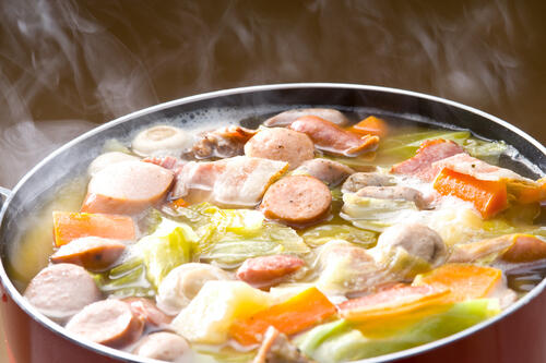玉ねぎのほかにもキャベツや人参、大根などの野菜を使ってウィンナーと一緒に煮る料理。洋風おでんとたとえられることもある。ポトフとして食べるのはもちろん、残りはクリームシチューにしたり、リゾットにアレンジしたりと、リメイクレシピも楽しめる料理だ。具材を大きめにカットしてよく煮込み、とろとろした野菜の旨みを味わおう。