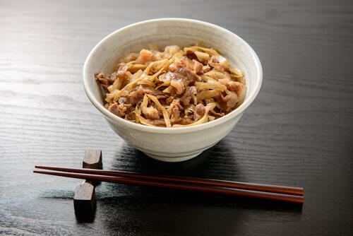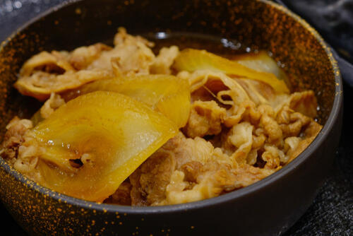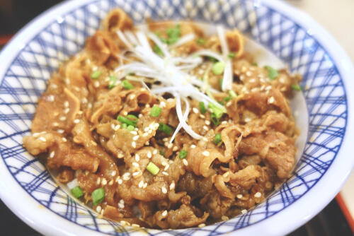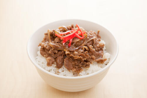 牛丼とは、薄く切った牛肉とタマネギ、しらたきなどを醤油、みりん、砂糖などで甘辛く煮込み、丼の上にのせた料理だ。
