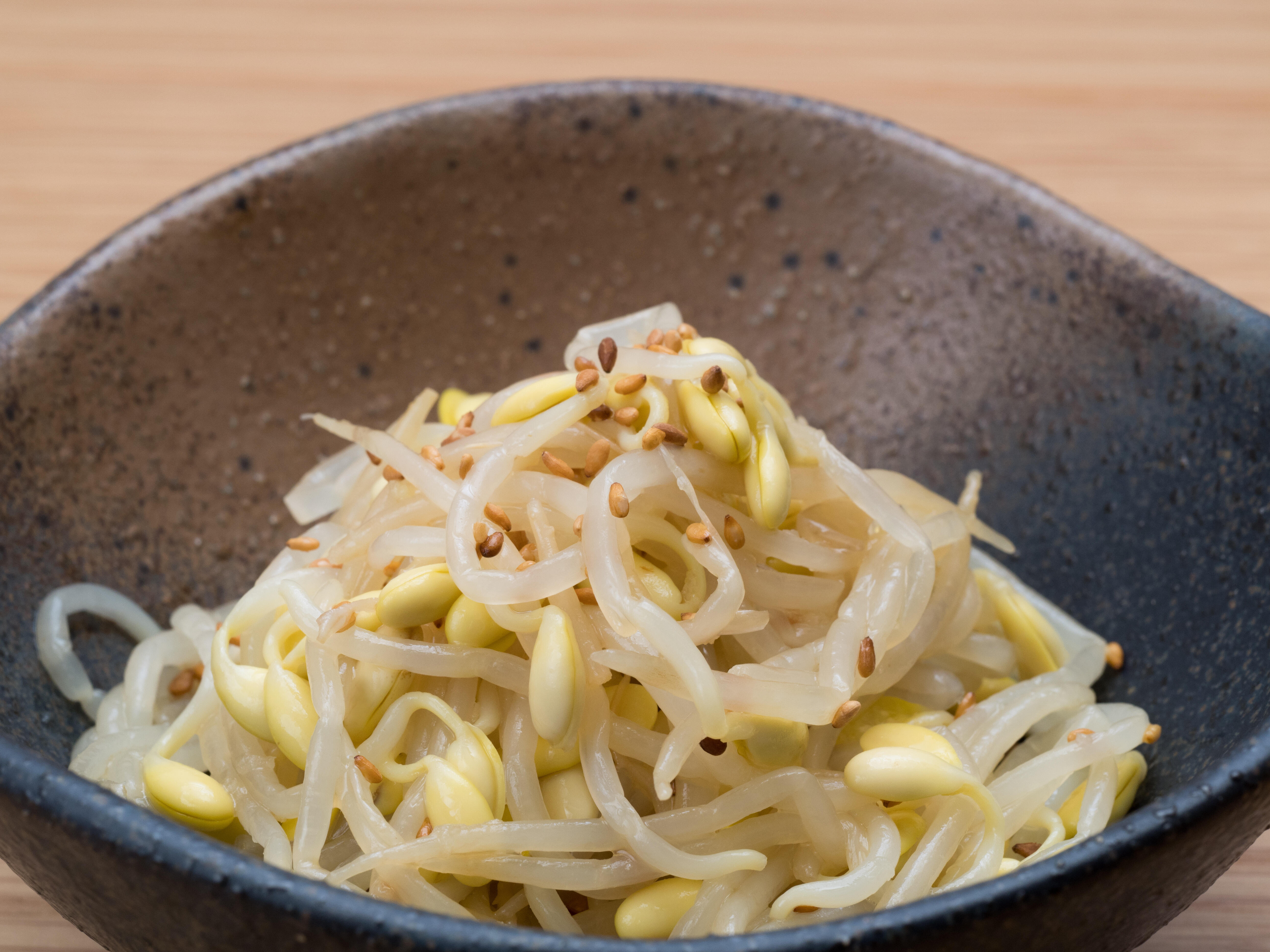 まず、大豆もやしを流水で洗い、ザルで水気をきっておく。鍋に水を入れて沸騰させたら大豆もやしを入れてふたをし、3分ほど茹でる。茹であがったら、ザルにあげ水気をきったらボウルに入れ、塩、鶏がらスープの素、ごま油、ごま、にんにくのすりおろしと一緒に混ぜたら完成だ。