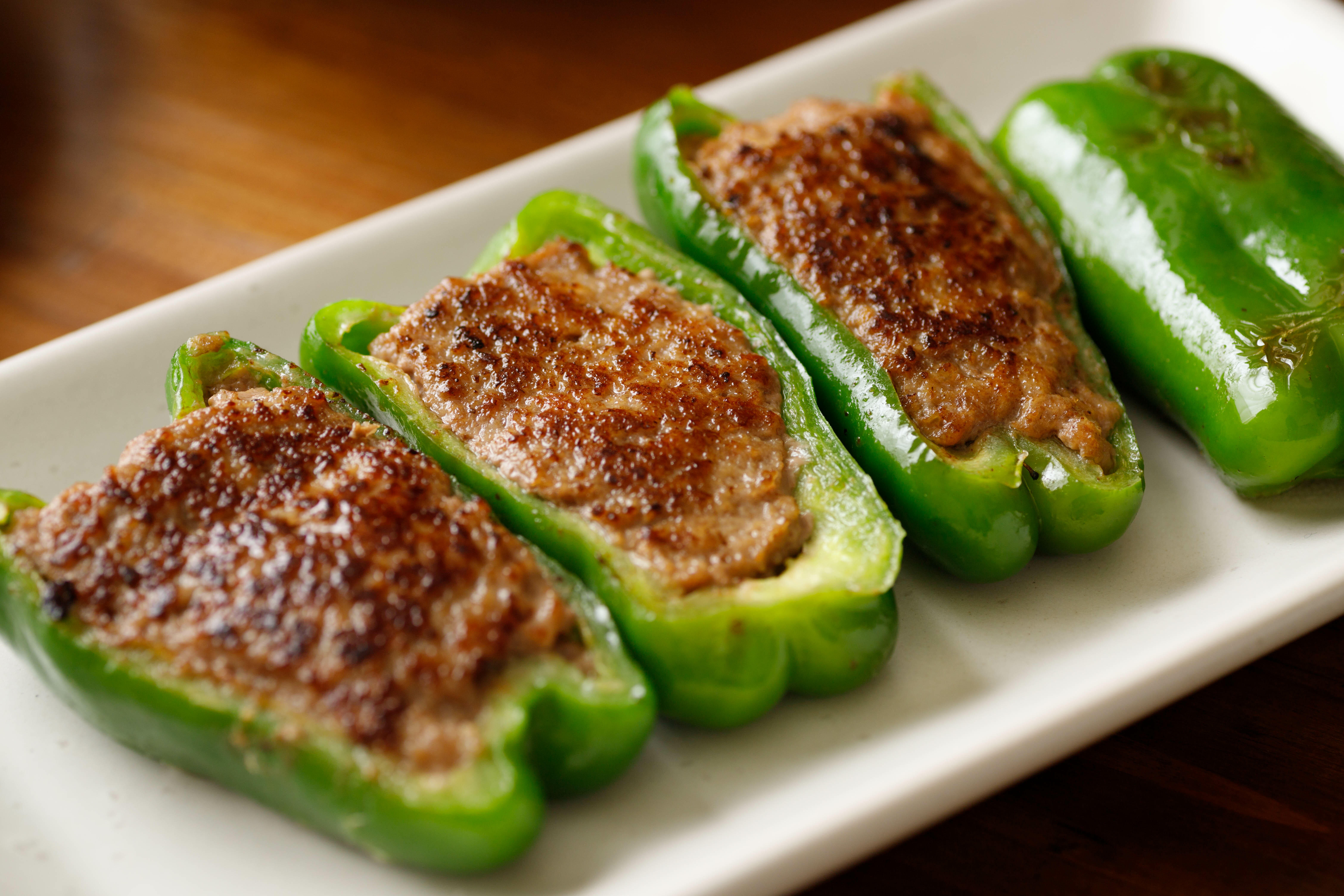 餃子の具材は、肉詰めの中身としても大活躍してくれる。肉詰めといえば、ピーマンが代表的で、半分に切って種を取り除いたピーマンの中に挽肉を詰めて焼く料理だが、餃子の具材を詰めても美味しい。さらにピーマンのほかにも万願寺唐辛子や、半分に切ったなすをくり抜いて餃子の具材を詰めて焼くのもおすすめの食べ方だ。