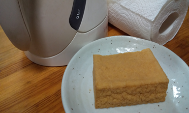 - キッチンペーパーで厚揚げの油分と水分をふき取る