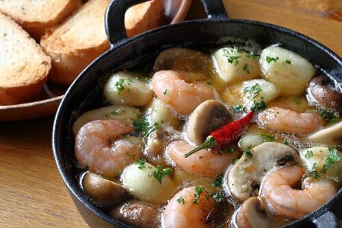 1. スキレットでつくる!エビとマッシュルームのアヒージョ