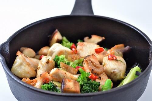 マッシュルームのアヒージョに鶏肉を加えるときは、よりコクのあるモモ肉が望ましい。鶏肉は、水分をしっかりと拭き取って塩と胡椒で軽く下味を付けておこう。フライパンにオリーブオイルを入れて、ニンニクと唐辛子で香りを付けたのち、マッシュルームと鶏肉を入れる。鶏肉の大きさにもよるが、5分ほど中火で煮込めば熱々のアヒージョができあがる。ブロッコリーやジャガイモなどを加えれば、一皿で栄養満点のおかずとなる。また、レモンやパプリカ、パセリなどでアレンジしてもよいだろう。フライパンを使用して少なめのオリーブオイルで仕上げれば、しつこさもないあっさりとした一品となるのである。