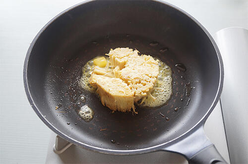 用意する材料はえのきの根元部分のみだ。えのきの根元部分は明確なラインがないため分かりづらいが、目安としては石づきの上の2~3cmを指す。触ってみると密集している部分があるので、そこを目安にしてもよい。根元部分を切り出せたら、フライパンで焼いていく。えのきステーキの味付けはいろいろあるが、ここでは定番のバター醤油味を紹介する。えのきの根元はバターで焼く。バターを熱したフライパンに入れたら、えのきの根元を入れる。焼き目が付いたらひっくり返して両面をこんがりと焼く。えのきは火が通りやすいため、根元といえども焼き目が付けば十分に火が通っている。最後に醤油を回し入れて絡めればえのきステーキの完成だ。