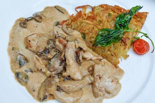 牛肉とたまねぎやマッシュルームなどを炒めたあとに、フォンドボーとほかの調味料を加えて煮込む。ごはんとよく合うビーフストロガノフが完成する。