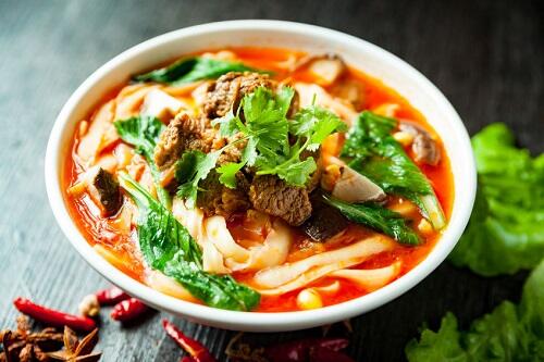 しっかりと下処理を済ませて一口サイズに切った牛肉(とくに牛すじ肉は茹でこぼす)と水、生姜、にんにく、ネギ、玉ねぎ、八角や花椒などのスパイスを入れて適宜アクをとりながら煮込んだら、醤油、豆板醬、紹興酒で味を付けて少し煮込み、スープを作る。味が強くなってしまうので、スープができたら八角は取り除いておこう。別の鍋で茹でたうどんを丼に盛り、その上に煮込んだスープをかけ、煮込んだ牛肉と玉ねぎ、茹でたチンゲンサイ、高菜漬けをのせたら完成だ。