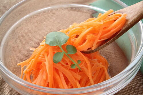 耐熱容器に千切りした人参と水、酢、砂糖、塩を加えて加熱し、ブラックペッパーをかけたら完成だ。電子レンジで作れるので、忙しい朝の弁当作りにおすすめの一品だ。