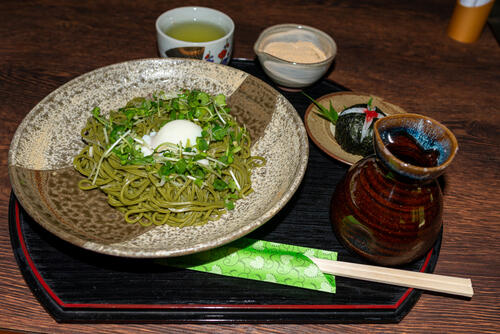 茶そばをアレンジして食べる方法のひとつが、ぶっかけ茶そばだ。香りと彩りのよい茶そばに、納豆や卵黄などをトッピングし、めんつゆをまわしかけ、絡ませながら食べる。 めんつゆと納豆のふくよかな旨みが、茶そばと絶妙に絡み、奥深い味わいが広がるはずだ。