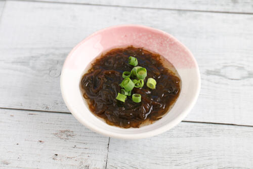 もずくの特徴や塩抜きする方法を紹介した。ちなみにもずくに含まれる、ぬめりのもとであるフコイダンはさまざまな研究によって多彩な生理機能が報告されている(※1)。加熱にも強いので、使用用途を気にせず食べることができるのも特徴のひとつだ。