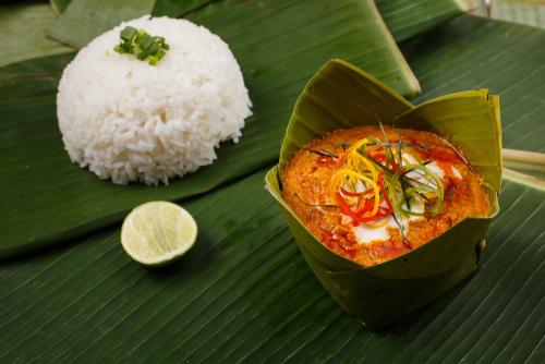 クメール料理の代表的な存在といえるアモックは、とくに日本人に好まれやすい料理になるだろう。アモックは、魚や鶏肉、卵、野菜などの食材に香辛料とココナッツミルクを加え、カレーのように米にかけて食べる料理。甘めのカレーのような味で、とても食べやすい。